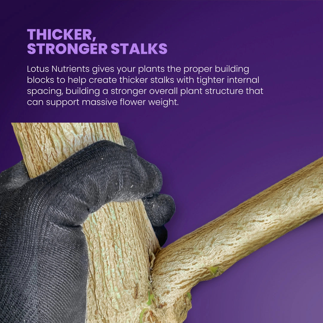 Lotus Nutrients gives your plants the proper building blocks to help create thicker stalks with tighter internal spacing, building a stronger overall plant structure that can support massive flower weight.